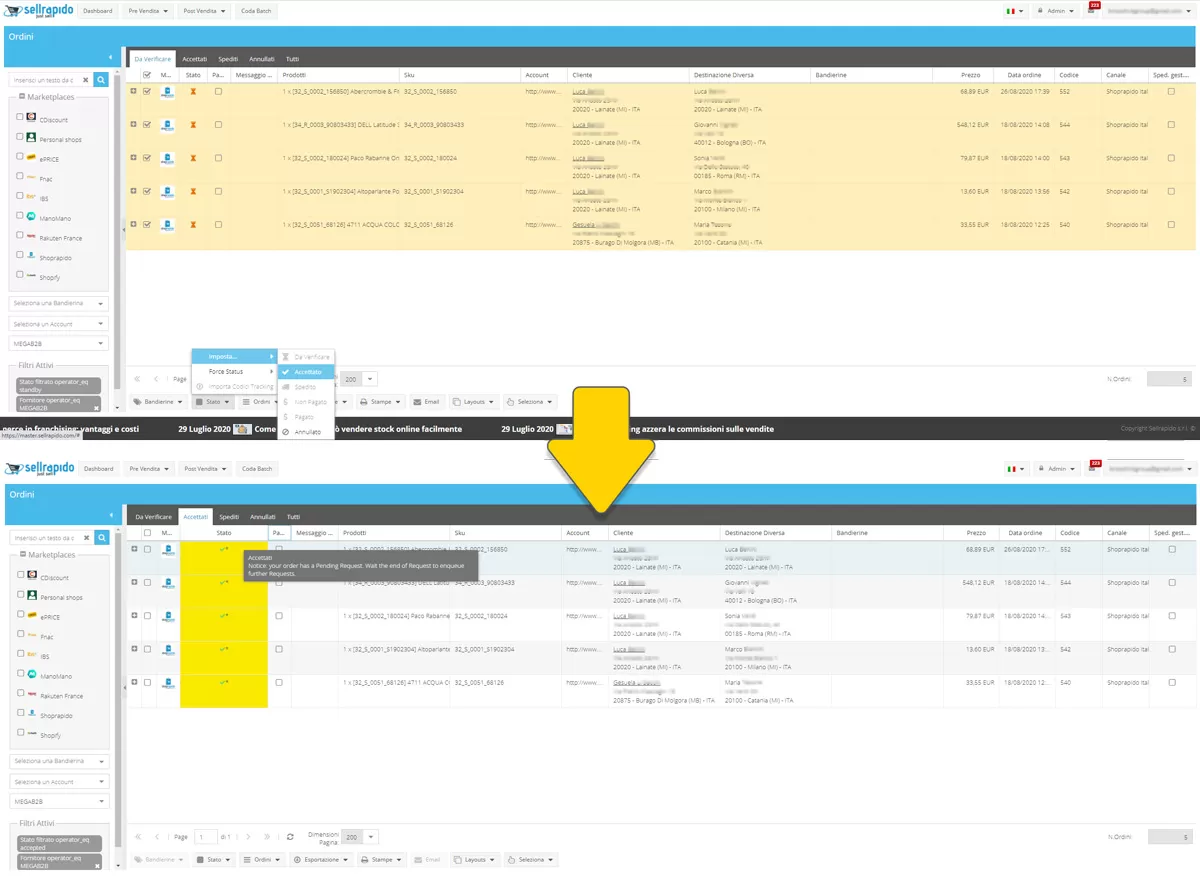 Quando il cliente avrà concluso l’ordine, lo visualizzerai direttamente nell’interfaccia web di SellRapido Manager. A quel punto ti basterà semplicemente impostarlo come “Accettato” ed il sistema effettuerà automaticamente il contro ordine al fornitore dropshipping appartenente al catalogo Sellrapido B2Bhub.