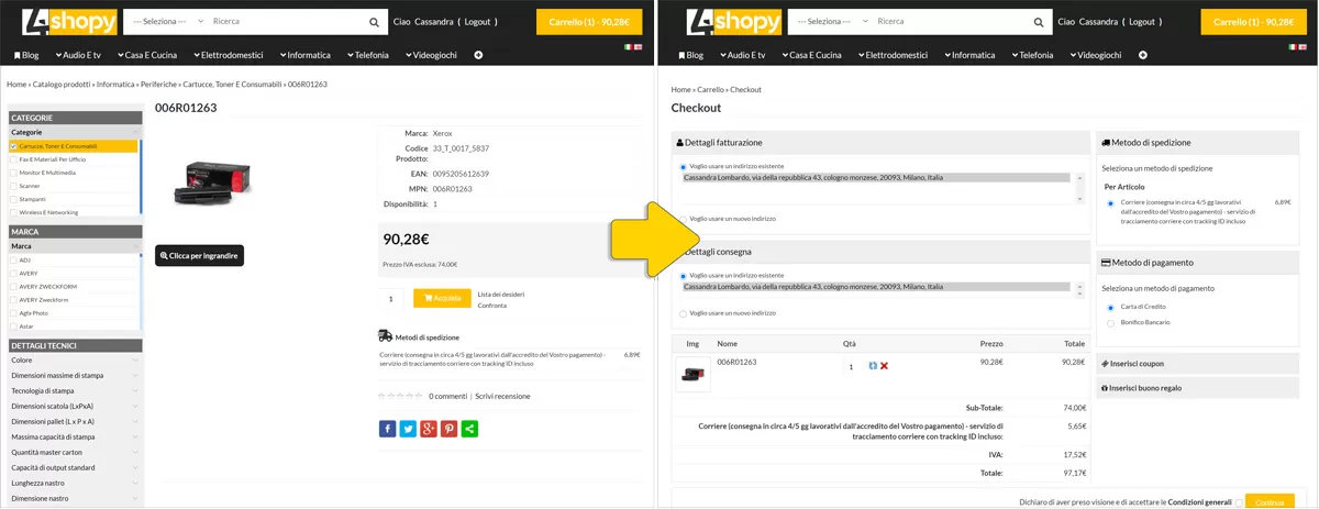Facciamo un esempio pratico: nell’immagine seguente vediamo un cliente che effettua un ordine su un sito ecommerce. Nell’immagine utilizziamo SellRapido Ecommerce ottimizzato, ma è possibile utilizzare i listini Sellrapido B2Bhub con gestione automatica dei contro-ordini su tutti i principali marketplaces (Amazon, eBay, Aliexpress, ManoMano, Rakuten, etc).